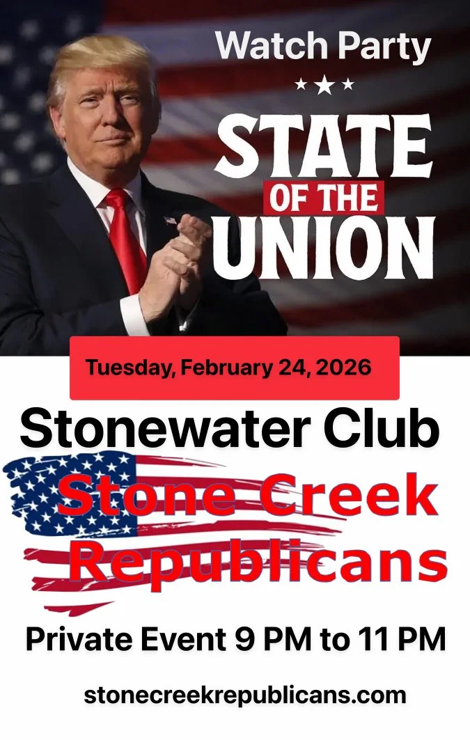 President Trump will be delivering the State of the Union address on Tuesday, February 24th, starting at 9:00 PM. The Stone Creek Republicans Club will host a watch party at the Stonewater Club. The Stonewater Club and bar normally close at 9:00 PM, but they will remain open until approximately 11:00 PM so we can gather to watch President Trump deliver his message to Congress and the American people. I guarantee you there will not be the likes of Pelosi tearing up any speeches this year.